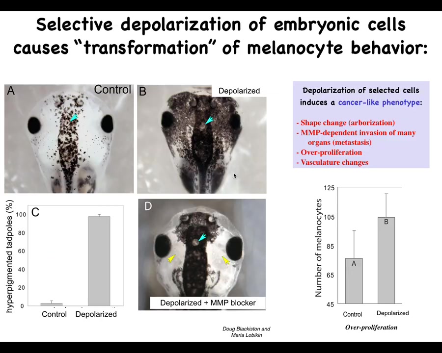What's apparent here is that it isn't the voltage of the cells themselves that determine what they're going to do. It's a voltage change in the environment as a physiological switch towards metastatic behavior. It's not even necessarily the microenvironment because in vivo, it only takes a few targeted cells to kickstart this. They can be quite far away, on the other side of the animal. We have data looking at where you can inject and where this property turns on. The entire tadpole can be transformed by just a small number of cells that have an aberrant electrophysiological signature at one location.