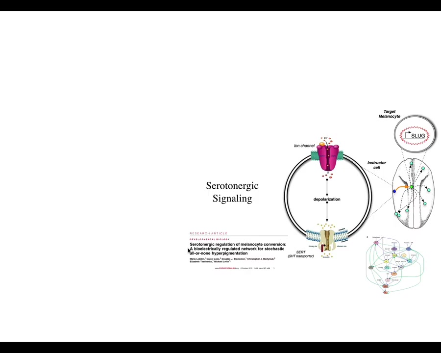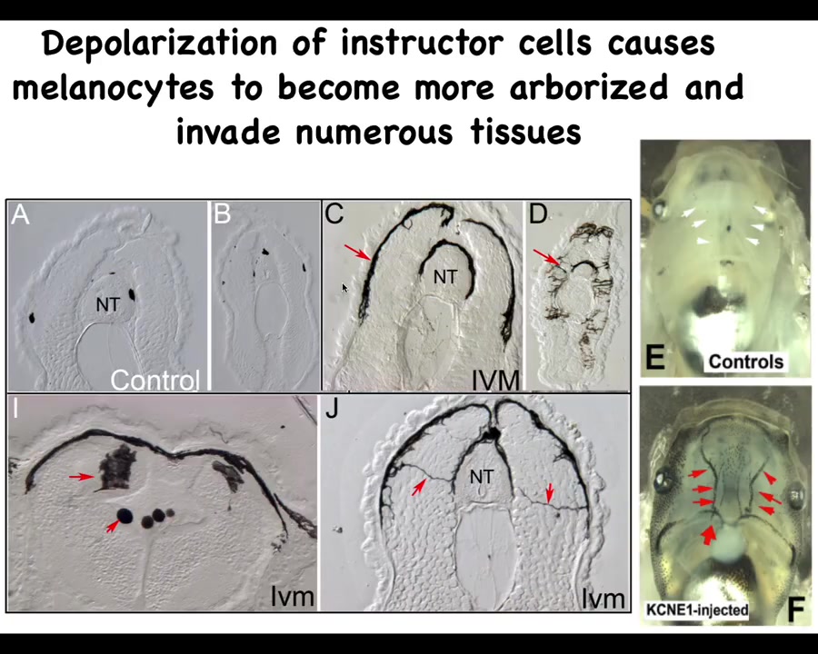 What's interesting here is that the effect is not cell autonomous. This is a cross-section through that tadpole. These are the cells. This is an injected dominant negative ion channel. These are the cells that we target, but the melanocytes that change their phenotype are at some distance. We've worked out how this works. That takes place through a serotonergic signaling pathway.