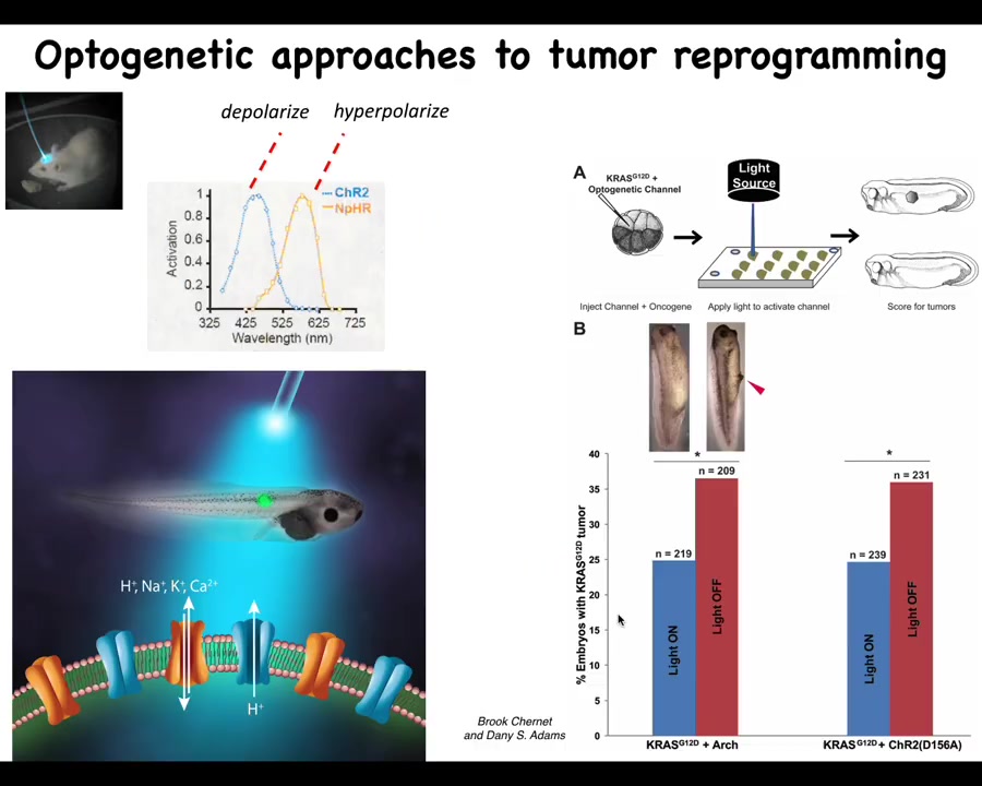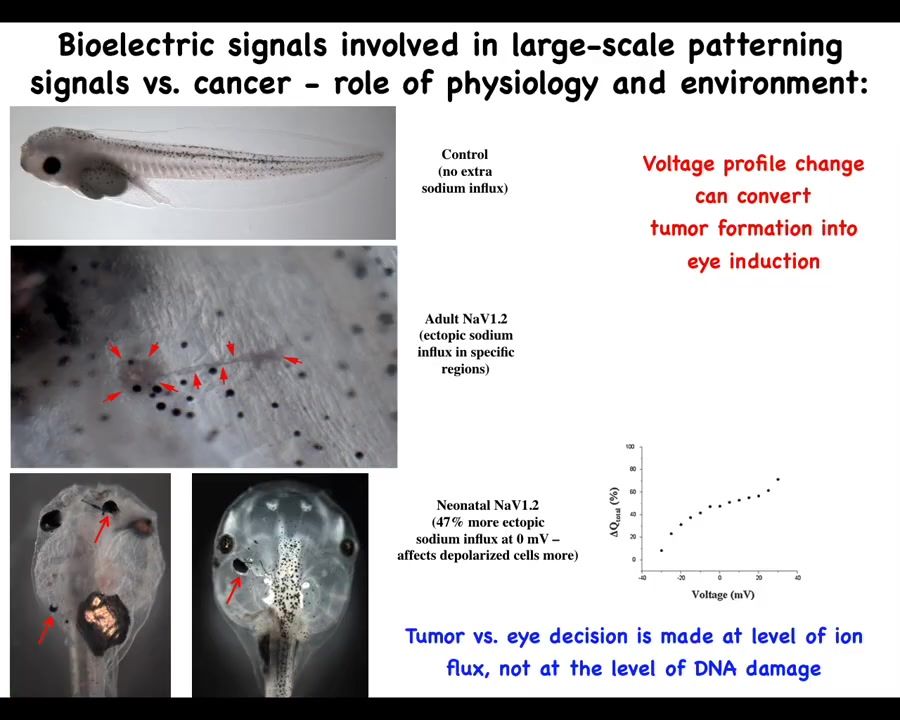 The role of the environment in this is important, and it goes against this mainstream idea that these phenotypes are very tightly linked to the genetics and ultimately to the clonal expansion of one particular set of mutations. Here's a tadpole, and this tadpole can have a tumor or an ectopic eye. What sets the difference between having a tumor or an eye is the amount of sodium that's getting in. And so this is following Mustafa's work. How much sodium is in your medium and how much of it is getting in and some other subtleties will switch between two radically different outcomes, an ectopic organ or a mutant. So we have to start to understand the primary role of the physiology, the collective decision-making in this process and see these ion channels as an important interface to that process.
