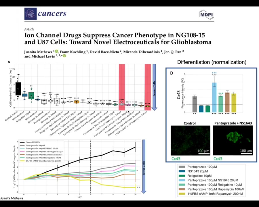 Our latest work by Juanita Matthews is now moving all of this from the frog model into human cells, first in 2D culture and now in cancer spheroids, and eventually in vivo, starting to look at glioblastoma. We're also looking at colon cancer and breast cancer. There is some really nice data on not only affecting the individual cell behaviors but even looking for signatures of normalization. The idea that when we use these drugs, not only do these cells stop many of their cancer-like behaviors, but they actually start to turn on some markers of normal multicellular tissues.