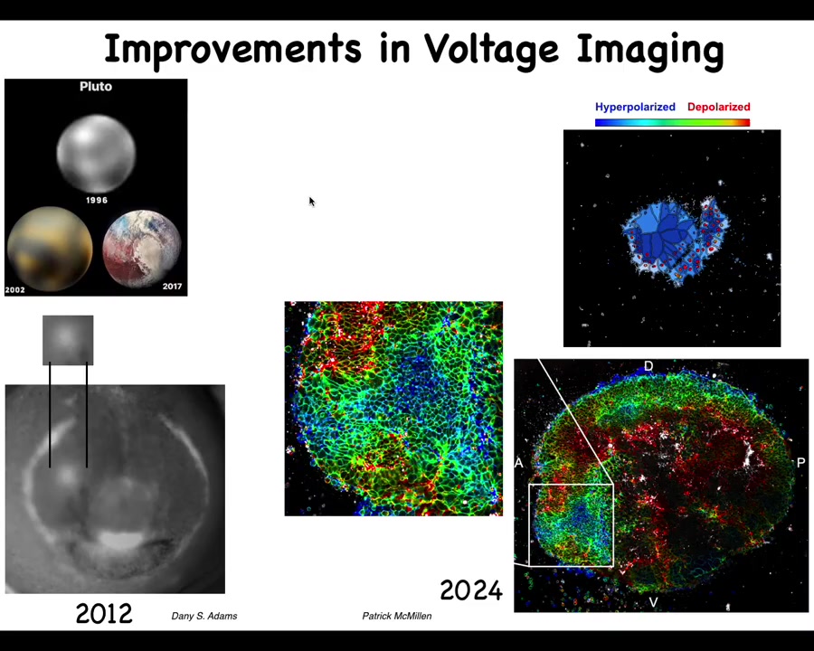 I always like this history of imaging. This is what Pluto looked like in 96 and this is what it looked like a few years ago. The idea is that imaging technologies are very important and the breakthroughs that we had made with Danny's work back in the day, starting to get, for the first time, an actual video. The first pictures of voltage in embryos were done by Thorlen around 2000 in Ken Robinson's lab. Then the first time-lapse movies of watching all the cells interact with each other electrically and the patterns, such as this electric face that Danny will show that presages and determines where all the organs, such as the eye, are going to be.