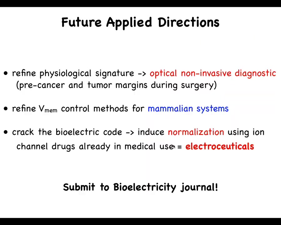 I've suggested that bioelectric properties can be used to detect, induce, and normalize neoplastic cell behavior. We now know that the behavior of these electric circuits can be modified in useful ways, just like we do in the nervous system with stimuli. That is not with hardware rewiring, but with various kinds of pharmacological, physiological, and other stimuli. I think the future involves pharmacological, optical, and other strategies guided by computational simulation platforms. One of the important things that needs to happen is knowledge of which bioelectrical states occur in different disease states and what the healthy states are.