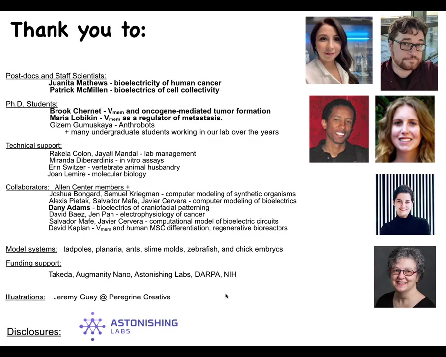 What I'd like to do is thank all of you for listening and thank the people who did the work. Juanita Matthews, who's doing all of the human cancer bioelectricity in our group, and Patrick McMillan, who is studying the bioelectrics of cell collectivity, and also developing ways to understand how these electric properties relate to single cell versus group cell behavior. Brooke and Maria did all of the early in vivo work on the cancer that I just showed you. This is Gizem Gamushkaya, who did the anthrobots, and that's a model that we're going to be using in the cancer field shortly. Danny Adams and her pivotal early work on looking at bioelectric patterns in real embryos. Lots of other students, lots of support staff, without whom we couldn't have done this work. Many, many collaborators.