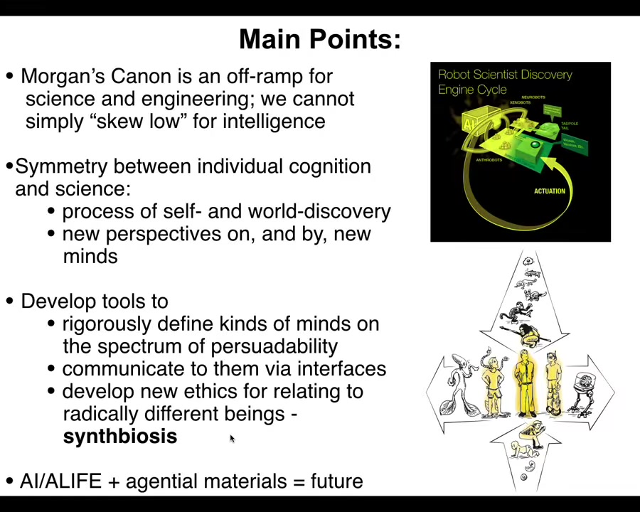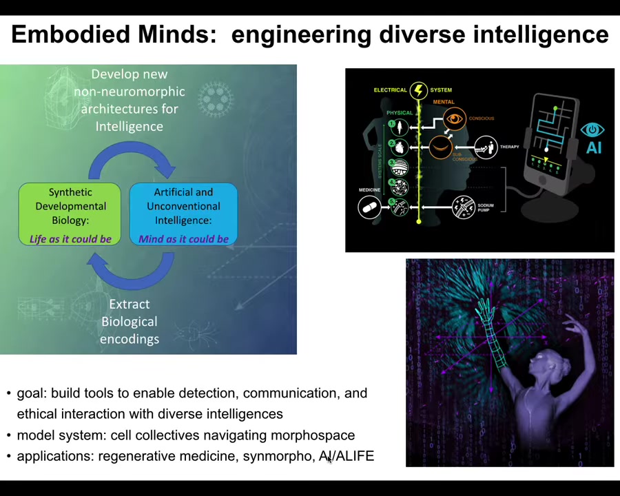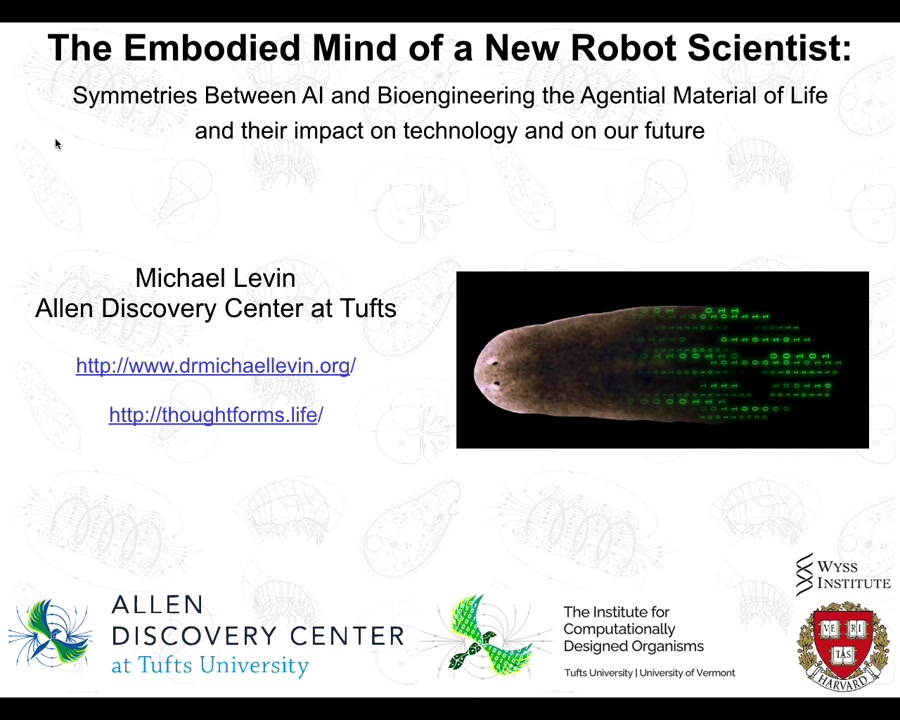 Towards the end, I want to introduce you to a new kind of embodied mind, a new colleague in the field of synthetic morphoengineering, a synthetic robot scientist with whom we are collaborating to hopefully make some important discoveries. So those are the three things I would like to show you today.