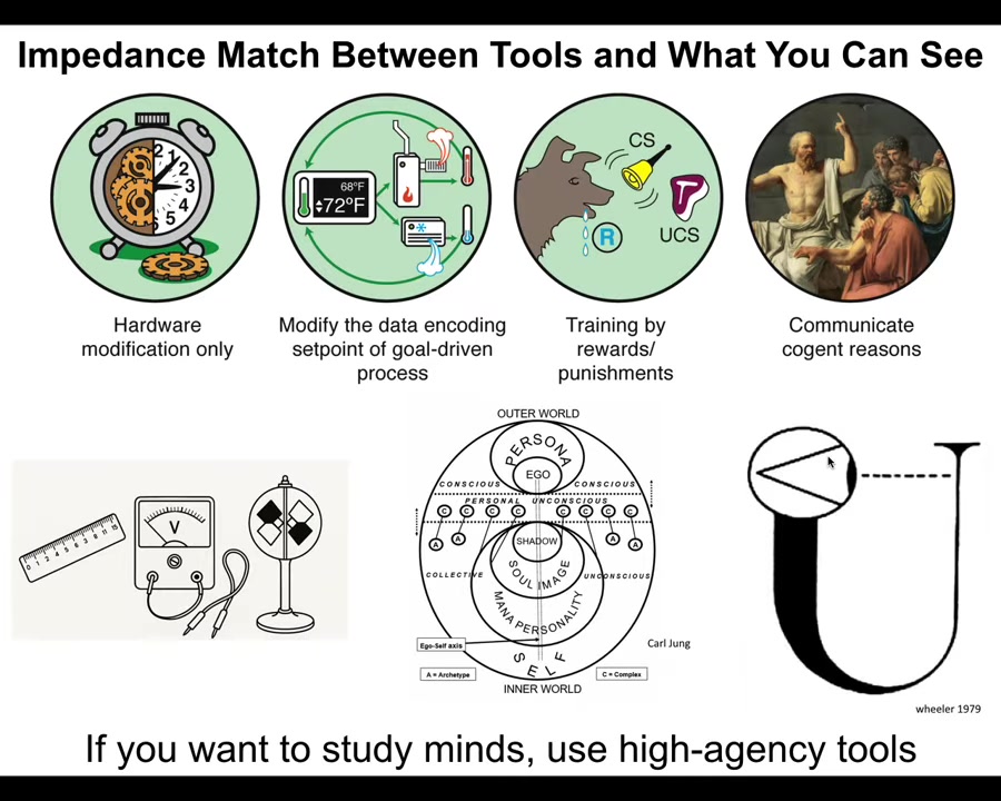 The first thing that I want to discuss is what I think is a very interesting aspect of how to do discovery and how to navigate one's world. There is a spectrum of cognition all the way from simple machines with whom you can only interact by modifying the hardware, rewiring, and then all the way up through systems that are amenable to the tools of cybernetics or control theory or behavioral science such as training, and ultimately through psychoanalysis and psychology and love and friendship and those kinds of things. It's a very wide spectrum. Where a given system lands on the spectrum is not obvious. You can't know that from a philosophical armchair. You have to do experiments and find out. I think it's very important to realize that there has to be an impedance match between the tools you're using and what you're able to see. For example, I think that physics sees mechanisms, not minds, because generally speaking, the tools of physics are low-agency tools. The interface that it uses, rulers, voltmeters, and various other things are actually pretty low-agency tools. If you want to study minds, you have to use high-agency tools, AKA other minds. It takes a mind to recognize a mind and to help you as either a scientist or a being living in the world, to identify other agents. People like Wheeler have thought about what it means for the entire universe to be observing itself and how much capacity to detect agency there is in the large-scale process like this.