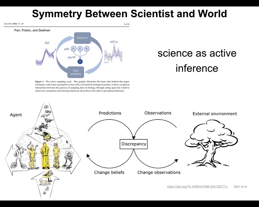 I want to talk about three things in particular. I want to describe the symmetry between what it is to be an active agent navigating the world and the way that we do science and the way that we learn about the world around us. I think these things are fundamentally very similar.
