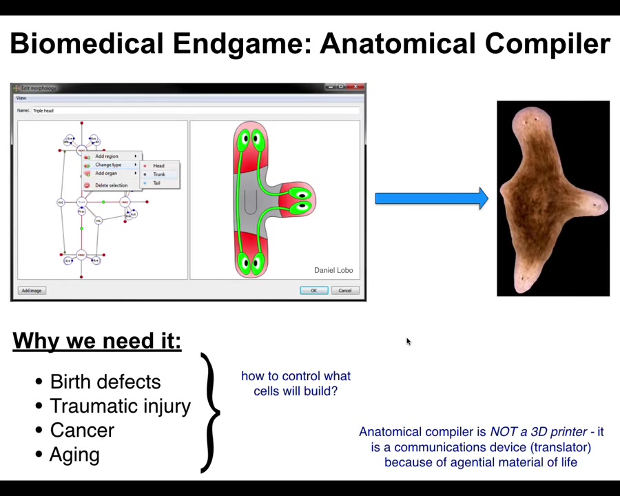 That's because this anatomical compiler is not something like a 3D printer. It is not for micromanaging the cells or the molecular pathways inside of them. It is a translator. It's a communications device that's designed to take the goals of the engineer or the scientist and translate them to be the goals of the goal-directed living system. That is a very unconventional view of biology. That is certainly not how most biologists think about it. That, I think, is the barrier that's holding us back from transformative regenerative medicine.