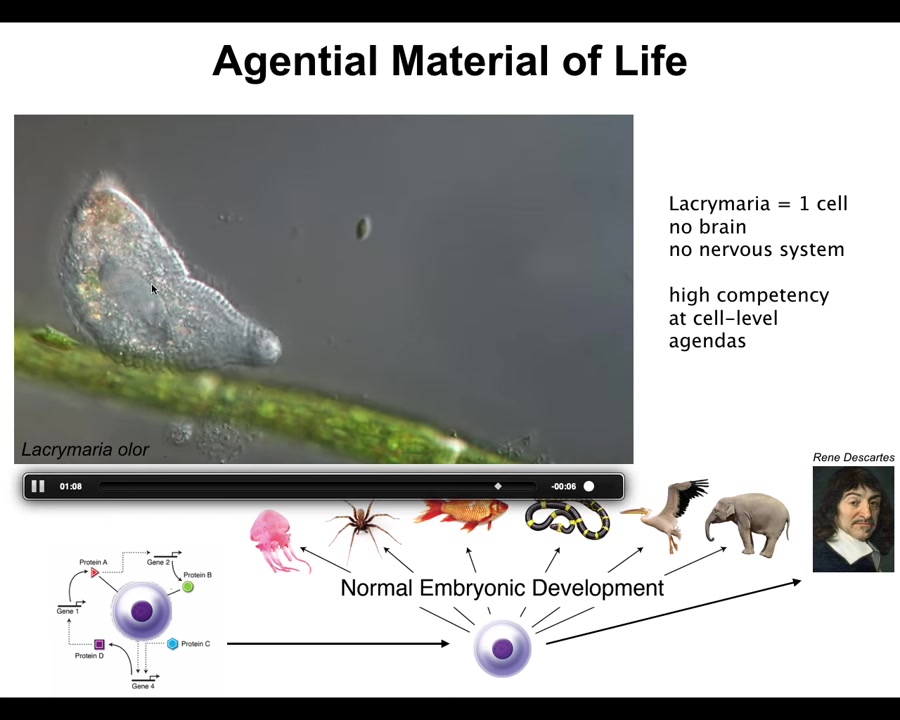 Even inside this little creature, the chemistry—the molecular pathways—are already capable of at least six different kinds of learning. We discovered recently that the molecular networks alone, as a free gift from mathematics, can do several different kinds of learning, including Pavlovian conditioning. We are in our lab trying to take advantage of this for drug conditioning and various other medical applications. Even the material inside cells has certain cognitive properties. It can learn from experience.