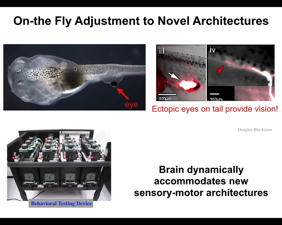 The first is that it makes on-the-fly immediate adjustments to entirely novel scenarios. What I'm showing you here is a tadpole of the frog Xenopus laevis. Here's the mouth, the nostrils, the brain, the gut is back here, and this is the tail. We've prevented the two primary eyes from forming, but we put an eye on its tail. When you induce an eye to form on the tail, it makes an optic nerve — that optic nerve, you can see it, does not go to the brain. It sometimes goes to the spinal cord, sometimes to the gut, sometimes nowhere at all. But we've made this machine that enables us to automatically test and train these animals for vision, so optical visual cues, and we find out that they can see perfectly well.