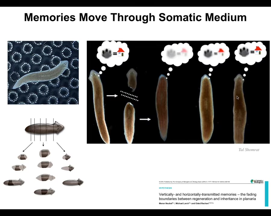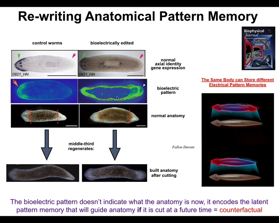 But what's not normal is the stored internal representation of what I will do if I get injured at a future time. It's actually a counterfactual memory, and we can read those memories out of the medium non-invasively. And if you do cut this animal, then what happens is the cells consult the memory and they say, a proper worm should have two heads, bang, and that's what they built.