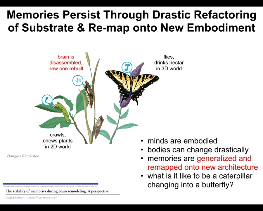 Again, this notion of biological plasticity, it's not the body shape that remains. All of that is plastic and can change, just like in that tadpole. And the information is not exactly persistent in its old form. It transforms. Biology is the study of the transformation of memories and of goal states and other properties through different physical media, appropriately to adaptively and appropriately to their new context, that we don't even have the beginnings of an understanding of how exactly these kinds of things are remapped onto new embodiments.