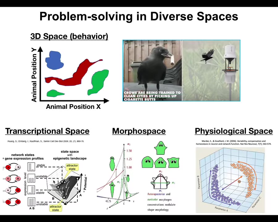 One important aspect of this is that biology solves problems in many, many different kinds of spaces. There's a lot of discussion, especially in AI, about embodiment. The idea is that you have to get around in the three-dimensional world. You have to engage with the world to have real intelligence. But one thing that biology teaches us is that we as humans are totally obsessed with the three-dimensional space because of our own evolutionary history and our own sensory motor architecture. We are okay at recognizing medium-sized objects moving at medium speeds. Birds and primates, and maybe a whale or an octopus, we can recognize. But biology has been doing that loop, that sensory decision-making effector loop, in other spaces long before nerve and muscle appeared.