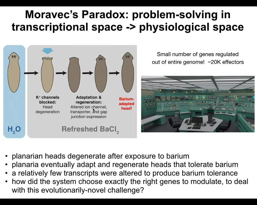 Planaria don't encounter barium in their life, or in fact, in their evolutionary history; there's no pressure to deal with this crazy new stressor. And yet, it's Moravec's paradox. You have a system that has tens of thousands of possible genes and can up- and down-regulate. So a huge number of effectors. How do you know which of those to fire to solve a new problem that you haven't seen before? It's like sitting in a nuclear reactor control room. There's just an incredible amount of buttons. What you don't have time to do is to start pushing all of them to see what happens. You have to very rapidly navigate a high-dimensional space and solve a problem you've never seen before. And planaria do this. They identify less than a dozen genes that allow their heads to now grow in this completely physiologically novel environment. So this is the kind of problem-solving that we need to understand both for the biomedical side and for the robotics. They're managing a space in which you can walk in tens of thousands of directions.