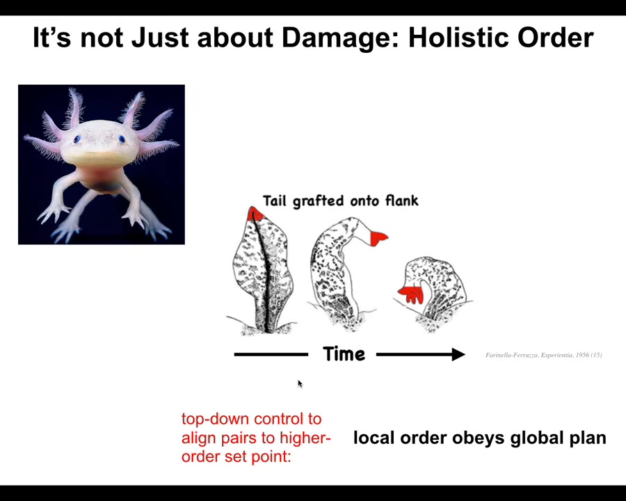 The first thing you realize is that morphogenesis, or the assembly of specific bodies from cells, is not just a kind of open loop emergent process. It actually is a process of error minimization. If they lose a limb anywhere along this axis, the cells will immediately spring into action. They will restore the structure and then they stop. The most amazing part is they know when to stop. When do they stop? When the correct structure has been completed. What happens is that the system can tell it has been deviated from its correct location in anatomical space. They get back to within some error tolerance, and then they stop. An error minimization scheme.