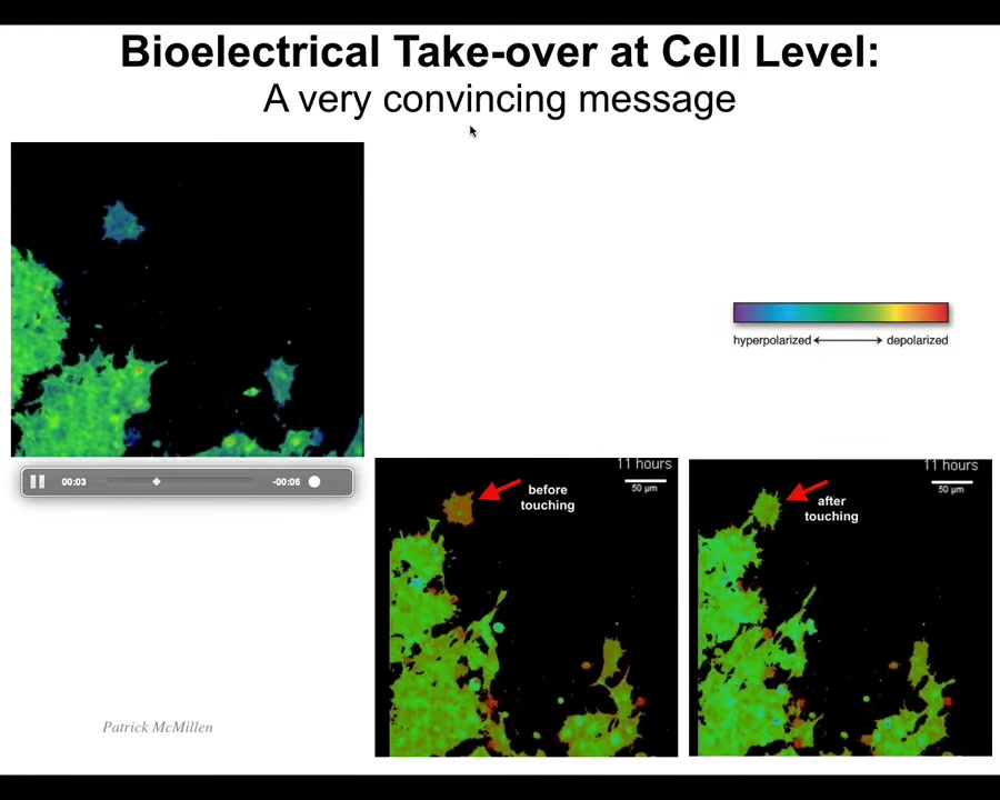 And I want to show you an example of how this happens. In particular, in my group, we study a lot the bioelectrical interface that groups of cells use to store goals and to communicate those goals to each other in networks. I'm going to play this video, but I want you to just look at the before and after frame. These colors indicate voltage. So we have ways of measuring the voltage of any given cell, not just neurons. Every cell in your body has voltage potentials, and they all make networks that process information.