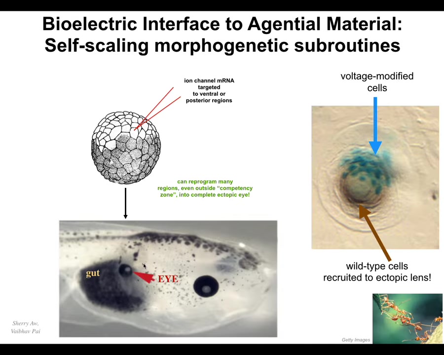 And I'll show you two very quick examples of how we use them for regenerative medicine. Here what we do is into this early frog embryo, into some cells that are going to make gut here, we introduce an ion channel that establishes a particular voltage state, and a voltage state just says, build an eye here. That's all it says. It's a very high level subroutine call. We don't know how to micromanage the process, thousands upon thousands of genes necessary to make an eye, to tell the stem cells what to do. We don't know how to do any of that. What we do know is how to say to the material, build an eye here. And when we do, here it is, very nice eye built where your gut should be.