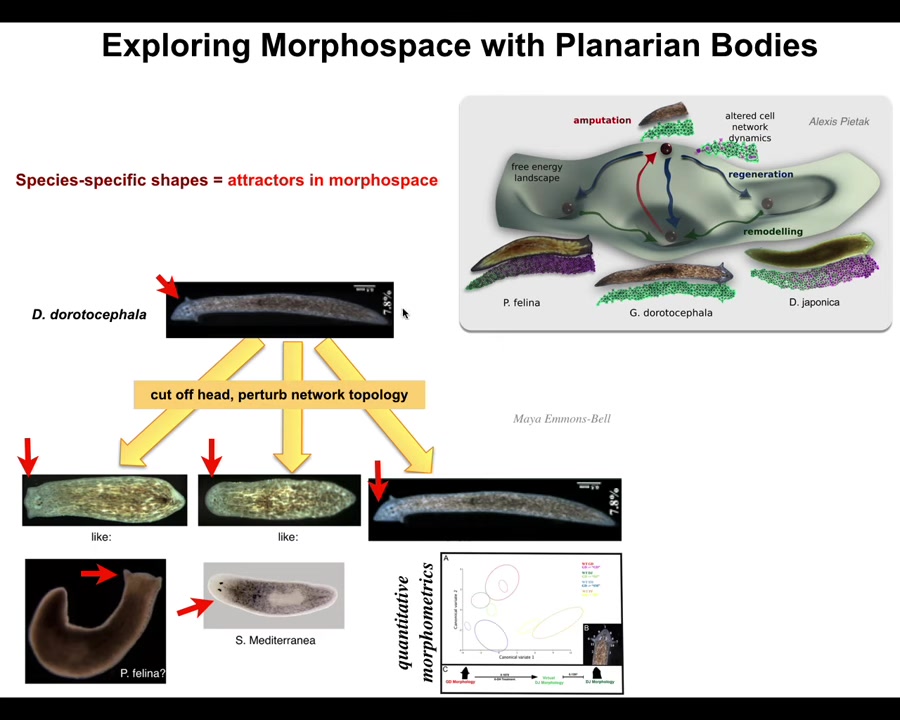 We can do some of this too. We can take this planarian, a nice triangular-headed Dugisia duratocephala, and we can amputate the head and perturb the electrical decision-making, the memory of what kind of head should I make. This can make flat heads like a P. falina. It can make round heads like an S. mediterranea. Of course, it can make its own head. There's about 100 to 150 million years of evolutionary distance between these guys and this. Again, no genetic change. We haven't touched the genome.