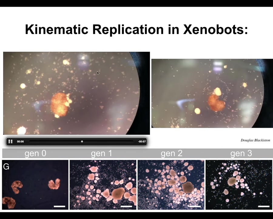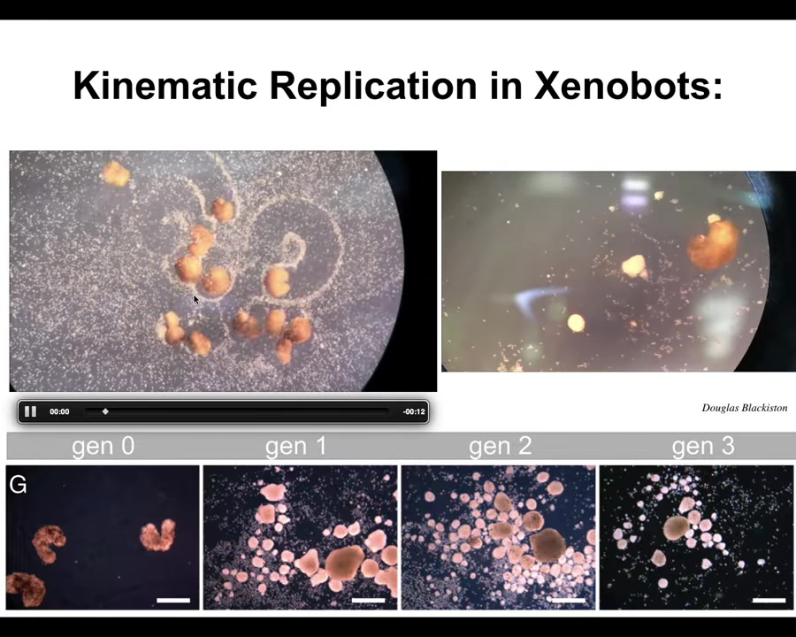 Now, notice something interesting. There have never been any Xenobots. There has never been any selection to be a good Xenobot. We don't think any other creature on Earth reproduces with kinematic self-replication. So it's very interesting to think about what the Xenopus genome learned in its time on Earth. Apparently it learned to do this. So it can make Xenobots, and this is an 83-day-old Xenobot. It's turning into something. I have no idea what it's turning into. They have distinct behaviors here.