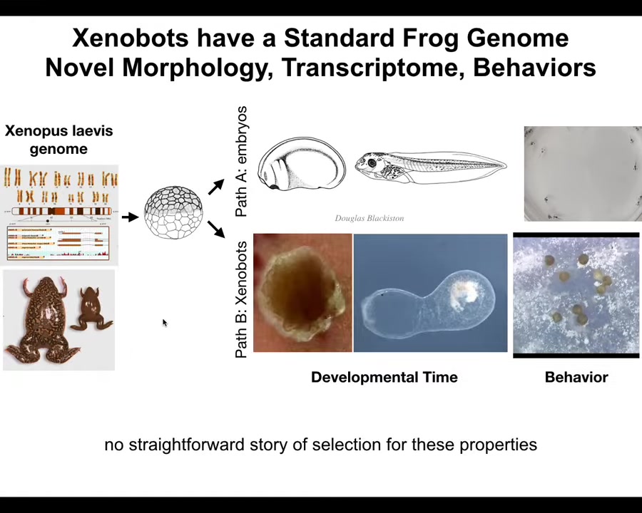 So I think we need to go beyond just saying that it's emergent and really understand that latent space of possibilities of why specific interfaces are pulling down specific forms of anatomy, of behavior. There are hundreds of new genes being expressed differently in these guys, about 600 new genes. So transcriptional behaviors, where are those coming from? Can we learn to predict and to manage them? You might think that this is some weird amphibian thing. Frogs are plastic and embryos are plastic. Maybe this is some very specific frog thing. I'll ask this question.