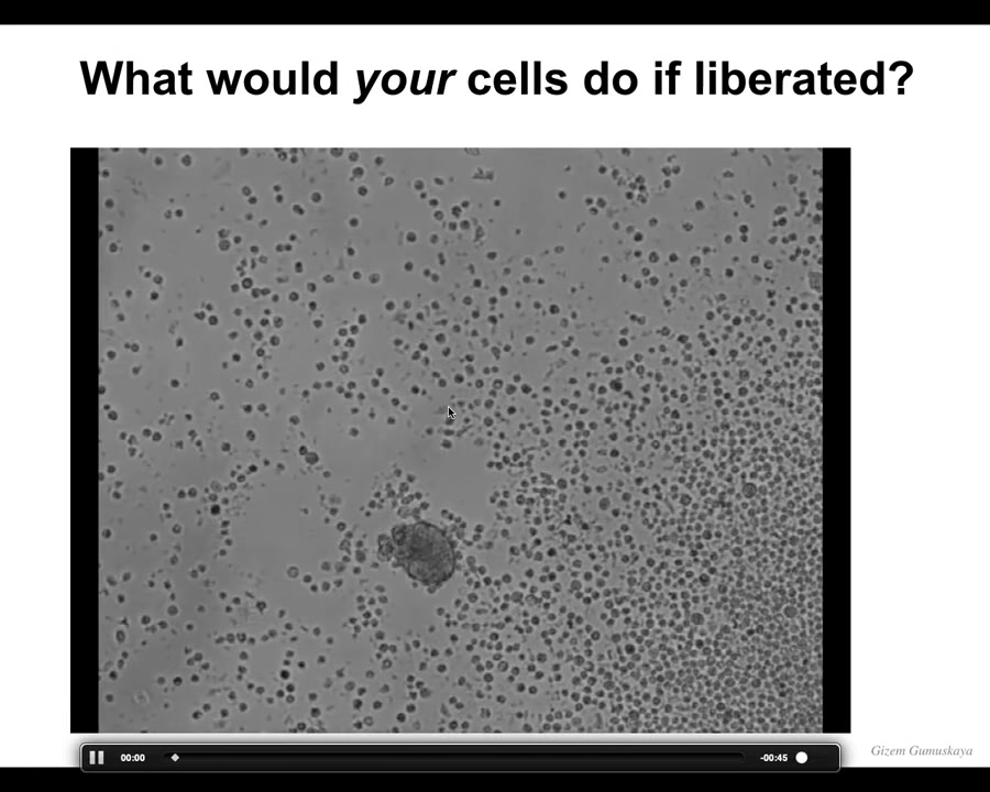 What would your cells do if we liberated them? This looks like something we might have gotten off the bottom of a pond somewhere. It looks like a primitive organism. If I asked you what the genome looked like, you might guess that it has a primitive organism's genome. If you were to sequence it, you would find 100% Homo sapiens genome.