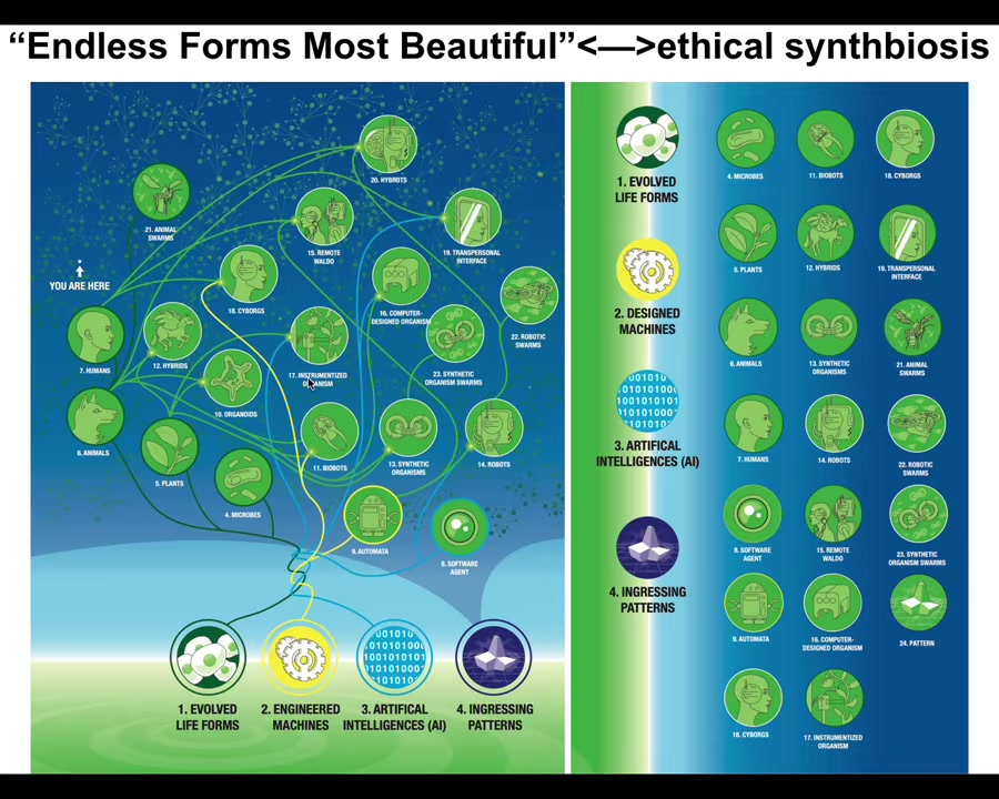 It's important that we now understand that because of the interoperability of life, because living things are constantly solving problems, they make few assumptions about their own structure, about the outside world. They have to make the best of every situation. Life is incredibly interoperable. Almost any combination of evolved material, engineered material, and software is a viable embodied mind that will benefit from ingesting patterns from this latent space. We will have, as we already do, cyborgs and hybrots and chimeras and synthetic beings of every kind. All of Darwin's endless forms most beautiful are a tiny little corner of this space of possible beings. We need to ramp up our game in being able to recognize and relate to all of these different kinds of novel embodied minds with which we will increasingly share our world.