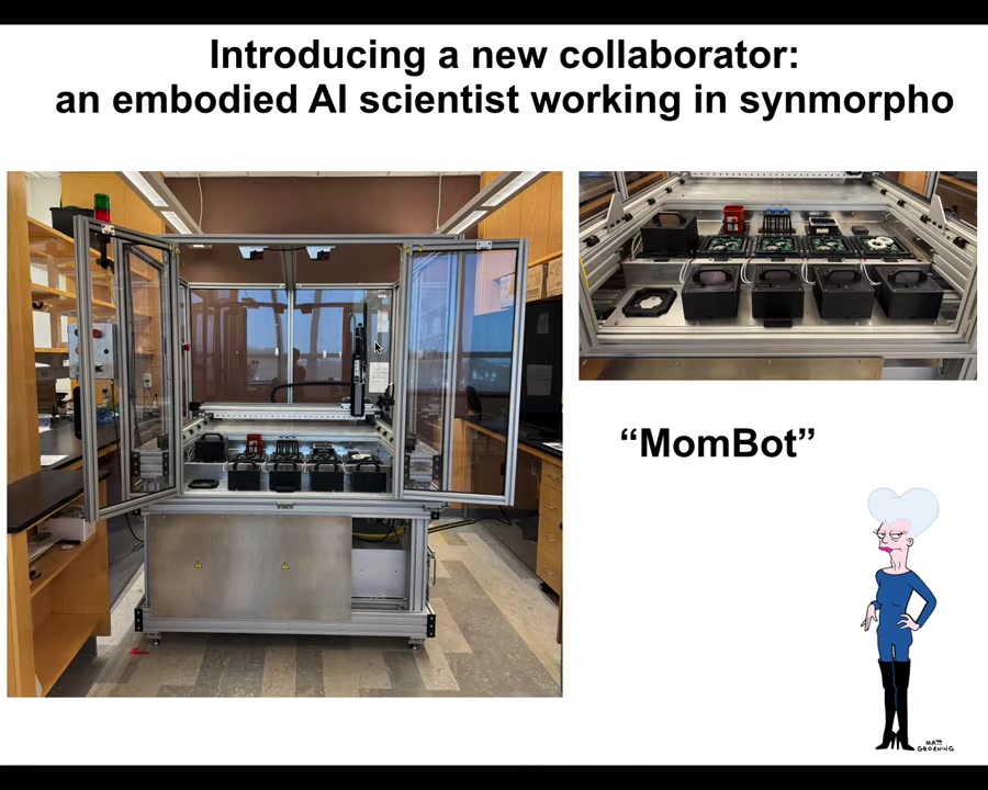 Also important is the use of the system to communicate with unconventional minds to help us. This is the diverse intelligence research program to help us recognize very alien kinds of minds that exist all around us, to actually join with them, to be parts of collaborative, aligned, cooperative systems and actually be part of it. One way to look at this is not just as the automation of discovery, not just as an anatomical compiler, but the MomBot platform as a communication node, as a bow-tie node in between human scientists and the cellular collective intelligence. It is a translator interface, but it's not a passive translator interface. It itself is an active intelligence. This idea of having AIs and, in general, nested cognition that becomes interfaces between other cognitive systems is very powerful.