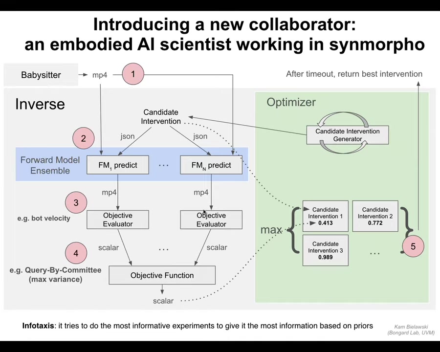 One of the things it does, I'm not going to go through all of the architecture, but Doug and Kim are writing a paper on this soon, and what it's actually doing is infotaxis. It's searching for more information by doing experiments. It tries to do the most informative experiment to give it the best way to revise its priors and to learn about the world that it lives in. That world is the world of morphogenesis. It's the world of behavior-shaping cues that have particular results in anatomy.