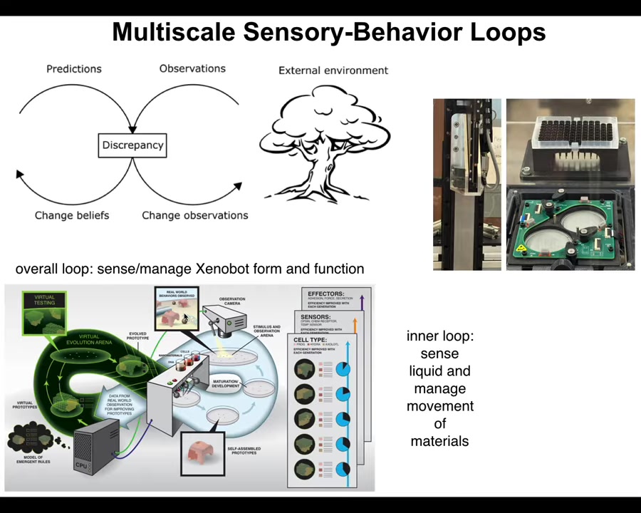 And so I just want to point out something interesting: going back to this idea of doing experiments and revising your picture of the world. This system does that at multiple scales. So at one scale, it has hypotheses about the biobots, the xenobots in particular, that it's building, and it revises those. But even the subsystems within that robot have their own proprioception loop.