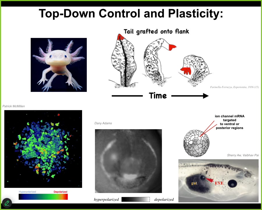 This is an ~8 minute very quick introduction about the context for developmental bioelectricity and some examples of how we use it as an interface to control growth and form. In this very short 3 slide introduction at a discussion forum, I tried to explain that bioelectricity is not just more physics we need to keep track of in morphogenesis, nor is it about applying external fields to have effects on cells. It's important in the body, and for biomedicine, for the exact same reason it's important in the brain: because it's the natural medium in which the collective intelligence of cell groups operates, and thus it's a great interface for deploying top-down, high-level interventions: it makes the living material reprogrammable in software, without having to edit DNA. By collaborating with the agential material of life (re-writing its setpoint memories, etc.) we can reach very complex outcomes that are too hard to micromanage from the molecular level. The context is cognition, not physics, with the payoff being the same kind of advance in biosciences as we've had in the move from having to work on computers at the hardware level (1950's) to being able to work in high-level languages or even prompts.