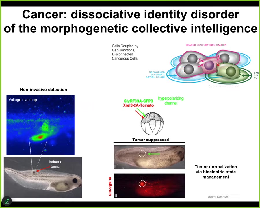 What we can do then is inject very nasty oncogenes, KRAS, all those kinds of things, if we at the same time manage the bioelectrics. So not kill the cells with chemotherapy, not fix the genetic defect, but simply force the correct electrical state where they stay connected to the rest of the network.