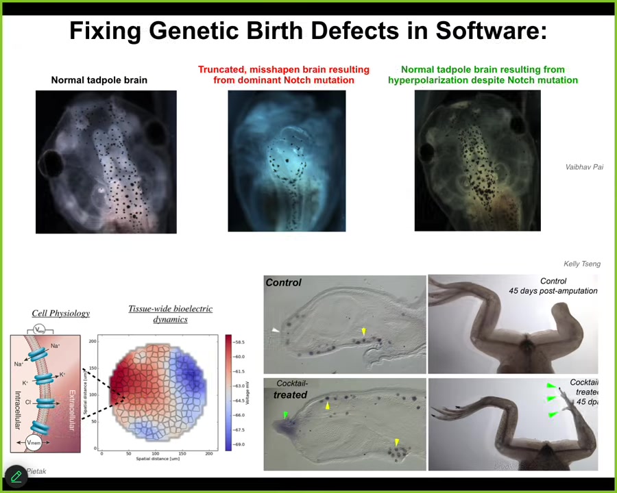 We created a computational model that allowed us to ask the following question. If the bioelectrics are wrong here, what would we have to do? What channels would we have to open and close to get the bioelectric pattern that tells the brain what size and shape should be? How would we fix the bioelectric pattern? The model made a prediction about a very specific ion channel, and when we open that channel using already human-approved drugs, they happen to be antiepileptics. What you get is a complete repair. The brain is normal, the gene expression is normal. Their IQs are normal. They go back to the same learning rates as wild types. We can, at least for some genetic defects. This animal still has this dominant Notch mutation, and it doesn't matter; the outcome is normal.